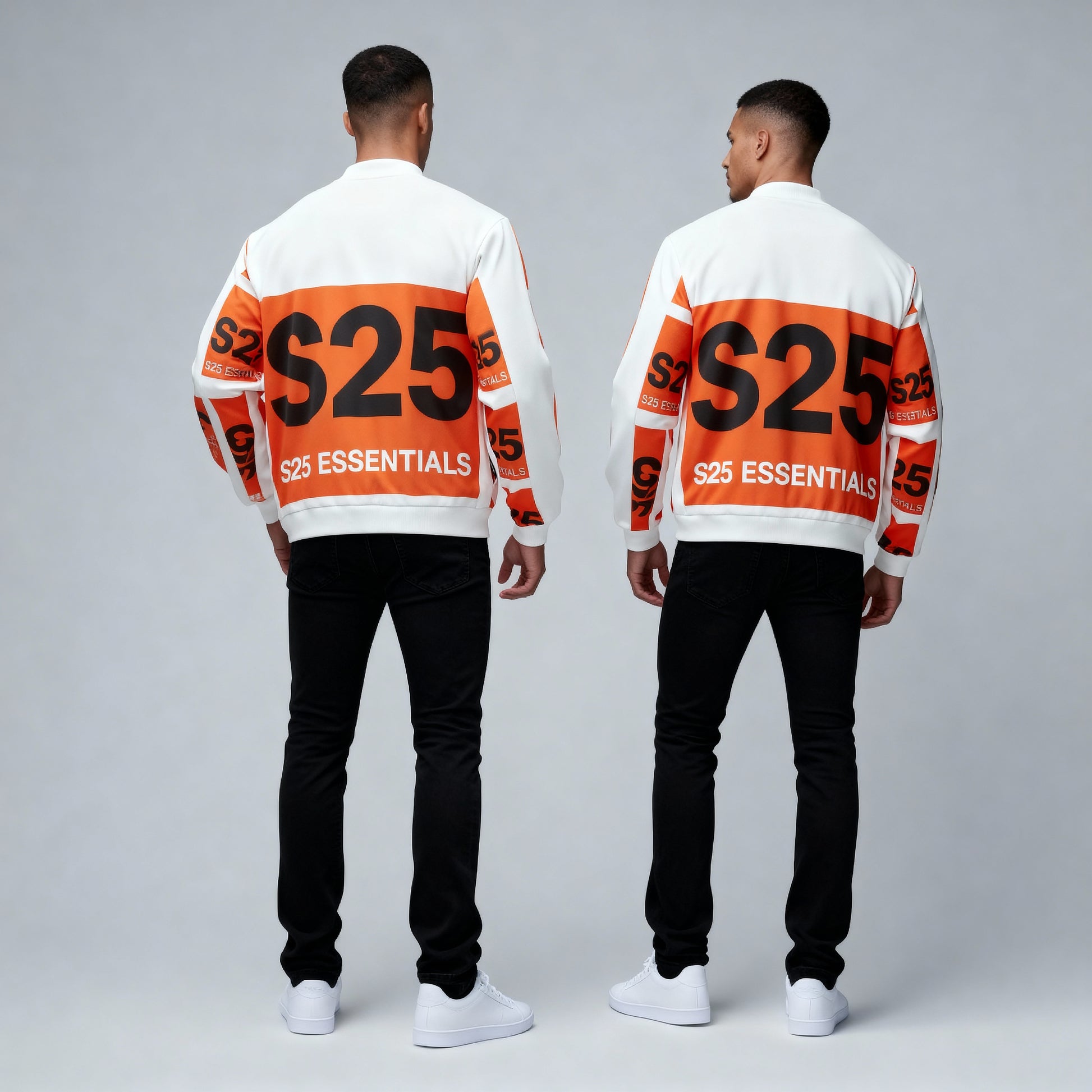 Minimalist bomber jacket with a white base and clean S25 logo detailing. Lightweight, versatile and aligned with modern streetwear aesthetics.